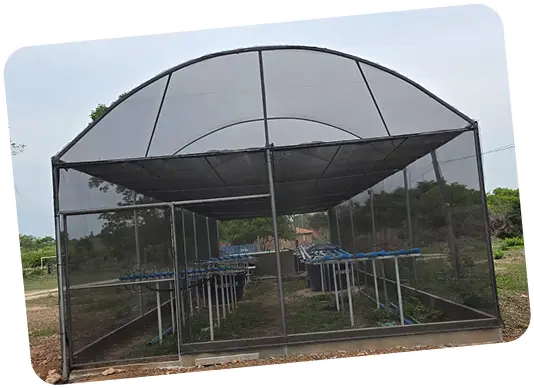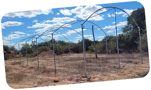 Estufa agrícola em arco, com dimensões de 6,00 m x 20,00 m x 3,00 metros com sombrites laterais e superiores. Um local ideal para o desenvolvimento da aquaponia.