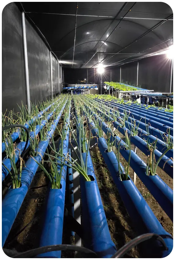 Sistema hidropônico completo – calatelas, cavaletes, reservatórios e todo esse sistema funciona de maneira autônoma.